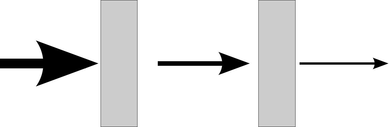 In this case, light passes through two objects, from left to right. Each objects attenuates the light. Light passing through any light absorbing object will by attenuated according to the transparency \(t\) of that object. Thus, if \(i\) is the amount of light entering the object, the light \(o\) leaving the object is given by